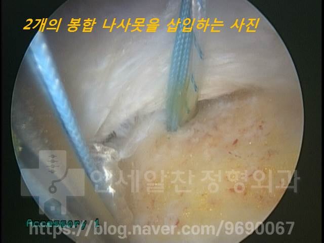 부착 시킬 뼈 내측에 2개의 봉합나사못을 삽입한 사진입니다. 이때 쓰이는 봉합나사못은 인대나 연골 등이 파열되어 찢어진 부위를 꿰맬 때 쓰이는 것으로 찢어진 크기가 클수록 봉합나사못을 더 많이 사용하게 됩니다. 이 환자의 경우 파열 크기가 크지 않아 2개의 봉합나사못을 이용하여 이열 봉합법 수술을 진행하였습니다.
