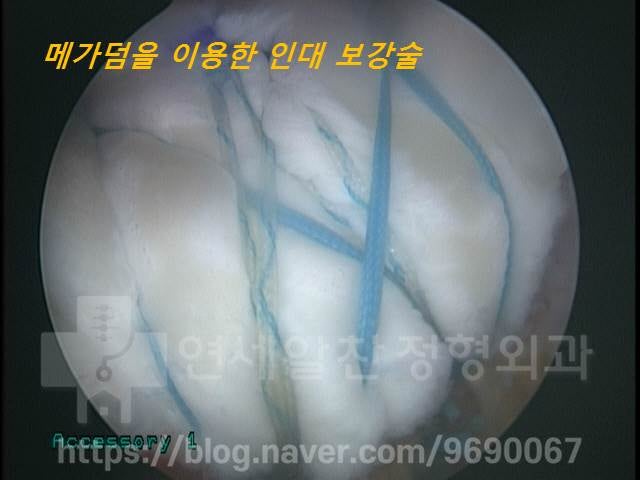 안타깝게도 이 환자의 경우 초기 회전근개파열 진단이 제대로 되지 않아 이미 인대가 많이 손상되어 약화된 상태였습니다. 그래서 퇴행성 변화로 약해진 인대를 보강하기 위해 메가덤(인조인대)를 이용해 보강술을 추가로 진행할 수 밖에 없었습닌다. 이렇게 인대가 약해진 상태일 경우 봉합술을 해도재파열되기 쉬워, 메가덤을 이용해 안정적으로 봉합하는 것이 효과적이기 때문입니다. 쉽게 말해 옷에 구멍이 생겼을 때 새로운 천을 덧대면 다시 쌩쌩하게 원상복귀 되지만 실밥이 풀리고 옷이 헤진 상태에서 다시 꿰맬 경우 이미 실이 늘어나고 풀린 상태기 때문에 금방 다시 구멍이 생기는 것과 같습니다.