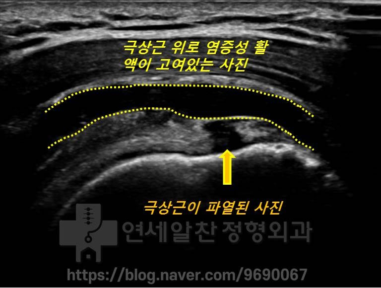 극상근의 초음파 검사상 전층으로 파열되어 완전히 단절된 모습이 관찰되었고 그 사이로 엄청난 양의 염증성 활액이 관찰되었습니다. 다량의 염증성 활액으로 인해 통증이 극심하고 팔을 제대로 쓸 수 없어 어깨 기능이 제한된 상태였습니다.