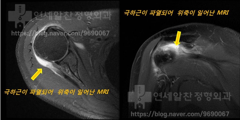 MRI영상에서도 초음파 영상과 같이 극상근의 전층파열, 극하근의 거의 전층파열에 가까운 점액낭측 파열이 관찰되여 상당한 양의 염증성 활액이 관찰되어 수술적 치료가 필요한 상황으로 판단되었습니다.