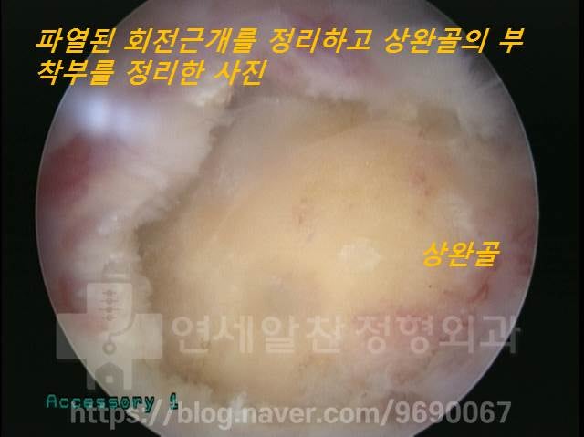 실제 관절경 사진에서 어깨회전근개파열이 심하게 진행되어 퇴행성 변화가 진행된 것을 확인할 수 있었습니다.