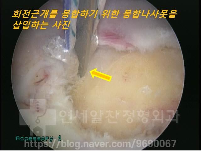환자의 경우 인대의 상태가 상당히 좋지 않았으며 원래의 인대만 봉합할 경우 재파열의 위험성이 있어 인조인대(메가덤)을 이용하여 이열봉합법으로 단단히 고정을 하였습니다. 어깨회전근개파열을 치료할 때 효과적으로 비수술적 치료를 하기 위해서는 제대로 된 진단이 필수입니다. 진단이 명확할수록 치료 효과를 높일 수 있는 것입니다. 효과적인 비수술적 치료는 1. 정확한 주사치료 : 손상된 인대에 제대로 주사제를 투여하려면 초음파를 통해 주사치료가 진행되어야 합니다. 2. 적절한 물리치료 : 조직의 혈류량 개선 및 염증반응 감소에 도움이 됩니다. 3. 전문적 재활치료 : 손상된 회전근개 주위 근육의 기능회복 및 강화가 필요합니다. 또한 어깨회전근개파열치료 시 수술이 필요한 경우 비수술적 치료를 아무리 한다해도 결국 '밑 빠진 독에 물붓기'식 치료밖에 되지 않으니 전층파열, 점액낭측 파열이 있는 경우 또는 6mm 이상의 파열이 있는 경우에는 수술적 치료를 하는 것이 보다 빠르게 회복할 수 있는 방법입니다.