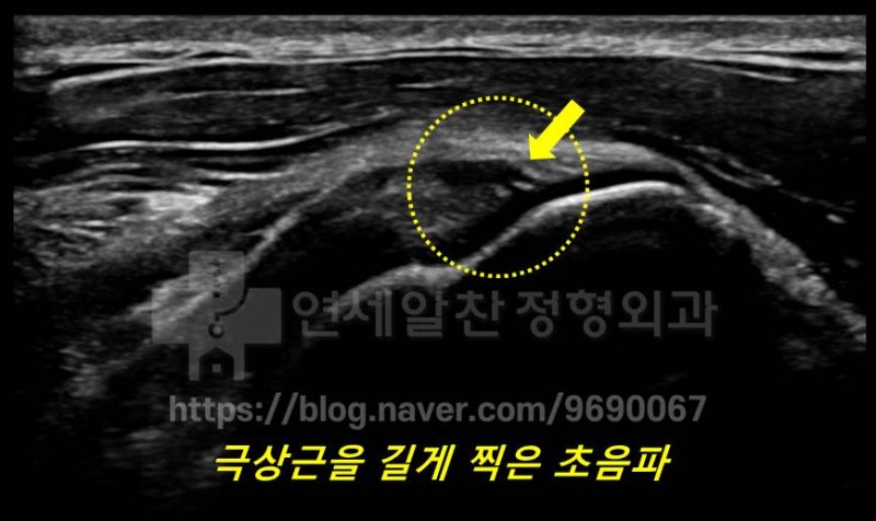 이 초음파 사진에서 보면 극상근을 길게 찍은 사진입니다. 노란색 점선안에 화살표로 표시된 부위를 보면 하얀 점이 2개정도 관찰되며 이것이 석회입니다. 1mm 도 안되는 작은 미세석회인데 이것 주위로 인대가 검게 변한것이 관찰됩니다. 초음파 상에서 인대는 하얗게 보이는 것이 정상인데 그 주위로 검게 보이는 것은 염증이 있다는 의미입니다.