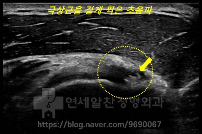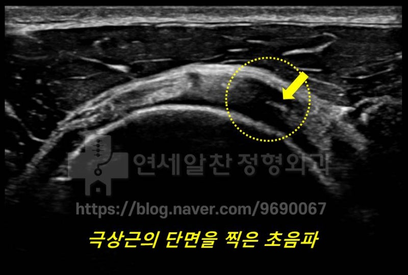 MRI 를 살펴보았을 때 노란 점선안에 보이는 극상근 부위에서 화살표 부위로 표시된 곳이 약간 하얗게 보이는 소견이 관찰됩니다. 이는 극상근내 염증소견이 있는 것을 나타내며 이것을 부분 파열이라고 진단하고 재생주사치료를 한 것으로 보입니다. 하지만 이 MRI 소견으로는 단순 염증 정도로 보이며 파열까지는 진행되지 않은 것으로 보입니다. 시간이 어느정도 경과 되었기 때문에 초음파를 통해 다시 한번 검사를 해 보기로 하였습니다.