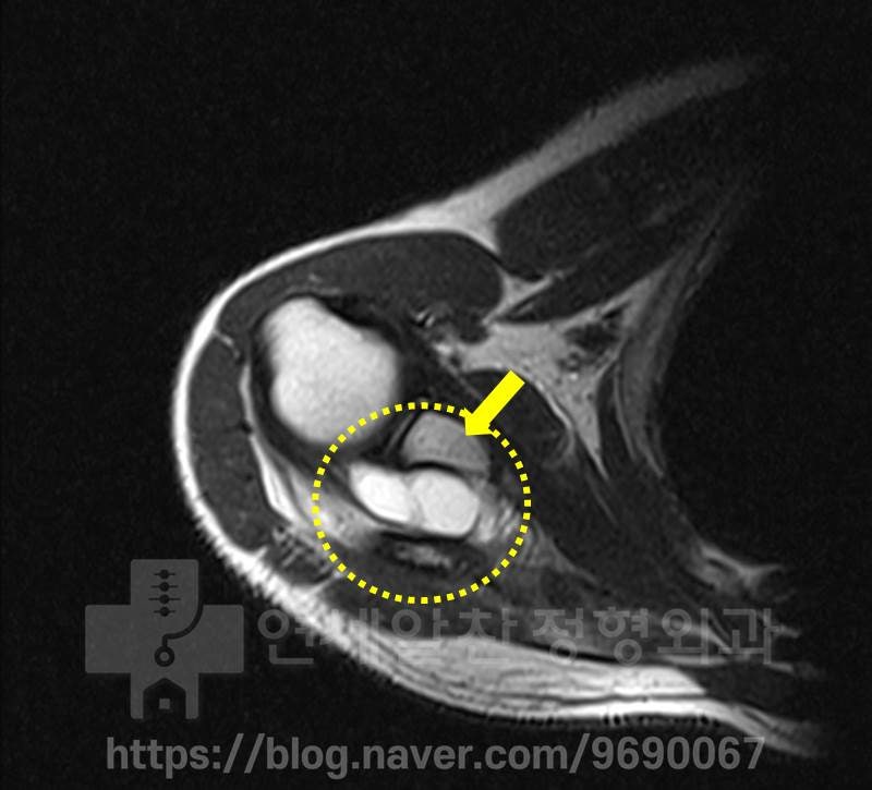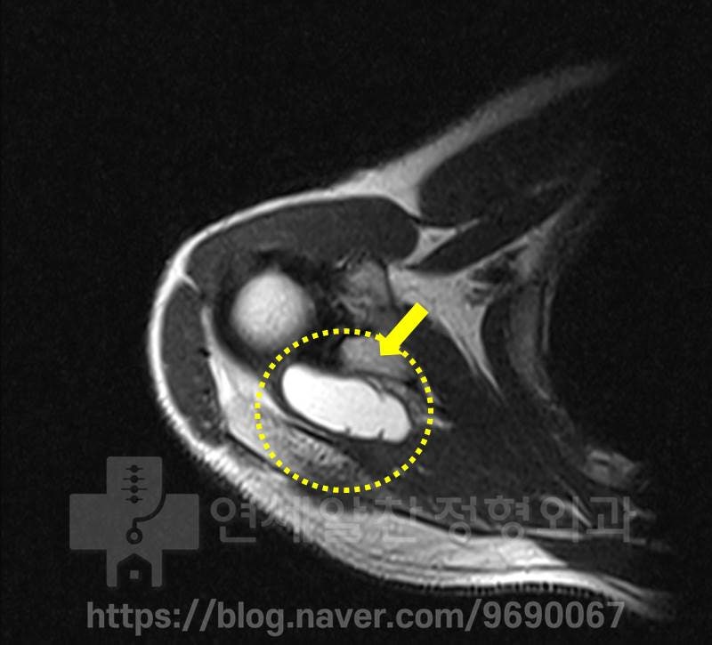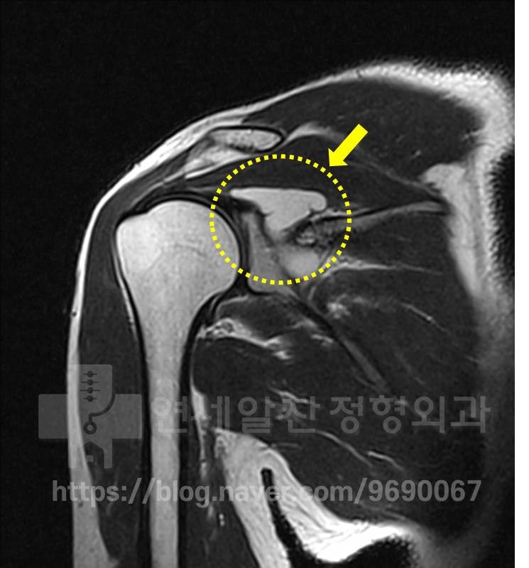 노란색 원형으로 표시된 부위의 하얀색 부위가 어깨 물혹입니다. 아주 커다란 어깨 물혹이 관찰됩니다. 하지만 관절와순의 손상은 관찰되지 않았습니다..