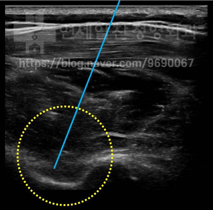초음파로 위치를 확인한 후 주사기를 이용하여 (파란색 선) 물혹을 제거하고 난 후 앞에 보였던 물혹이 완전히 제거된 것이 관찰됩니다.