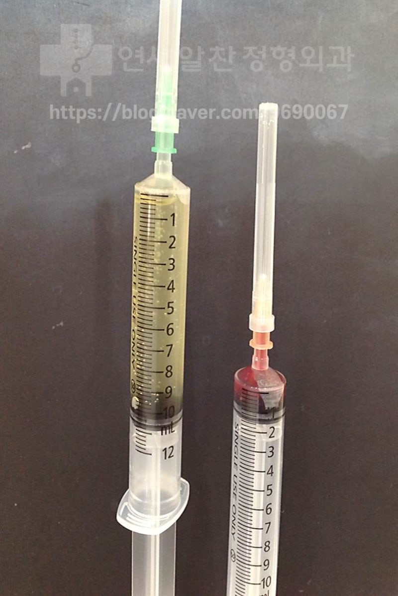 어깨 물혹을 주사기로 흡입한 사진입니다. 이 후 환자는 증상이 매우 좋아졌으며 점짐적인 재활 운동을 통해 근력도 많이 회복되었습니다. 1년 후 초음파 검사를 다시 하였습니다.