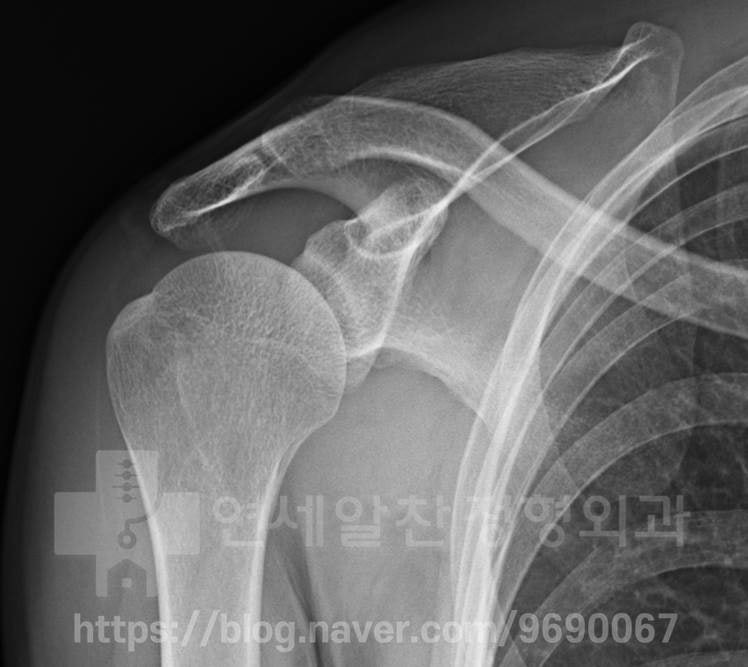 어깨회전근개파열 일 때 부분 파열인 경우 보전적 치료를 하게 됩니다. 부분파열의 크기나 양상에 따라 달라질 수 는 있지만 크기가 크지않고 관절면측 파열이 있는 경우 보전적 치료로 좋은 결과를 보일 수 있습니다. 보전적 치료로는 염증 및 통증을 줄이는 약물, 주사치료가 있으며 인대를 직접적으로 자극하여 치료하는 인대강화주사, 프롤로 치료가 있습니다. 또한 간접적으로 어깨회전근개파열 주변 혈류량을 증가시키고 조직을 자극할 수 있는 체외충격파 치료를 할 수 있습니다. 이외에도 파열된 인대의 부하를 줄이면서 주위 근육 및 인대의 강화 및 기능 회복을 위한 재활도 매우 중요합니다. 환자들이 " 파열이 있으면 보전적 치료로는 치유될 수 없지 않나요?" 하고 질문을 하십니다. 물론 파열의 크기나 양상에 따라 바로 수술적 치료가 필요한 경우가 있습니다. 하지만 보전적 치료로도 충분히 치료될 수 있는 경우가 있으며 이를 잘 감별하여 보전적 치료를 할 지 수술적 치료를 할 지 결정해 주는 것이 환자와 의사 둘 모두에게 시간과 노력을 아낄 수 있다고 생각합니다. 오늘 보여드릴 케이스는 4개월 전 헬스 운동을 하다 통증이 발생되었으며 처음에는 휴식을 하였으나 점점 더 통증이 심해져 타병원을 내원하여 극상근의 파열이 있다는 진단을 받았으며 수술적 치료를 해야 한다고 이야기를 듣고 본원으로 내원한 환자분 입니다. 우선 이학적 검사를 통해 극상근의 문제가 있음을 확인하였기에 (empty can test 양성) 정밀 진단을 위해 X-ray 를 검사하였으며 큰 문제를 발견하지 못했습니다.