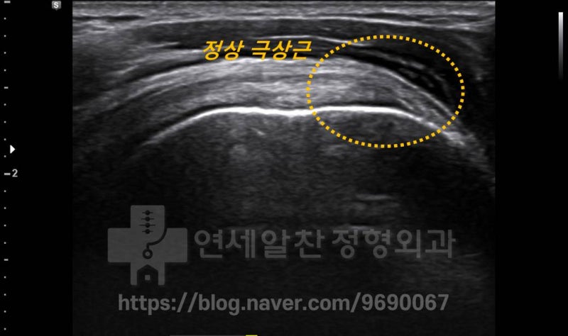 초음파에서 정상적인 극상근 부위를 관찰하였습니다. 둥근 점선 내로 정상적인 극상근의 형태가 관찰됩니다.