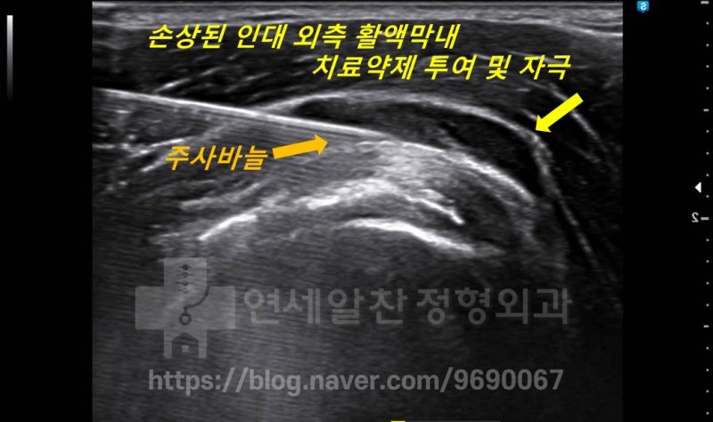 인대강화 주사를 시행하였으며 PDRN 제제 와 콜라겐 성분 제제를 사용하여 총 5회의 치료를 시행하였습니다. 상기의 초음파에서 보이듯 인대 내측으로 치료약제를 투여하고 적적한 주사자극으로 조직의 치유를 증진 시킵니다.