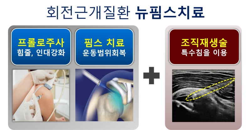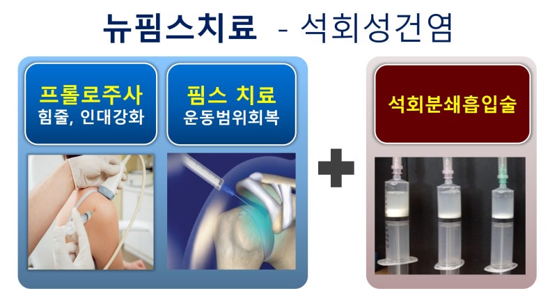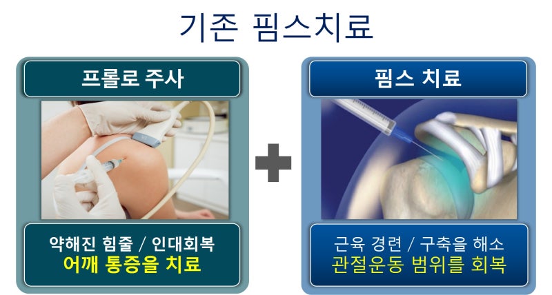 즉 약해진 힘줄이나 조직에 프롤로 주사를 통해 조직의 회복과 통증을 치료하고 특수한 침을 이용하여 근육과 관절낭의 구축을 해소하여 관절가동버위를 회복 시키는 치료 입니다. 하지만 어깨질환의 모든 질환을 이것 만으로 해결한다는 건 어불성설 이겠지요... 석회성 건염, 오십견(유착성 관절낭염), 회전근개 질환(부분파열, 염증, 건증 등등) 이렇게 다양한 질환에 대해 한가지로 다 치료할 수 있다면 얼마나 좋겠습니까. 하지만 무슨 만병 통치약도 아니고... 그래서 이번에 제가 직접 이를 보안하여 개발한 것이 뉴핌스 치료 입니다.