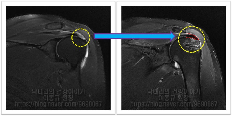 안녕하세요. 정형외과 전문의 이동규 입니다. 회전근개 파열이 오래 되면 혈류 제한이 있으면서 퇴행성 변화가 진행하게 됩니다. 이러한 경우 수술을 한다고 해서 완전히 치유되지 않을 수도 있습니다. 즉 새 천을 꼬매면 짱짱하게 봉합이 되지만 삭은 천을 꼬매면 다시 찢어질 수 있는 것과 같습니다. 회전근개 파열이 오래 된 상태라면 힘줄의 상태에 따라 보강술이 필요할 수 있습니다. 케이스를 보여드리겠습니다. 48세 여자환자 입니다. 5년전 회전근개 파열 진단을 받았으나 직장 및 개인적인 사정으로 수술을 하지 않고 아플때만 통증 주사만 맞아오던 환자였습니다. 이학적 검사상 empty can test 양성 보였고 극상근의 파열이 의심되었습니다. MRI 검사를 살펴보겠습니다.