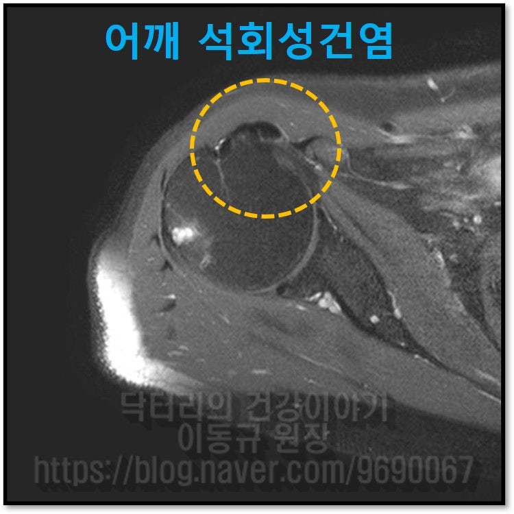 MRI 사진에서도 노란 원안에 까맣게 보이는 것이 어깨 석회성 건염으로 보입니다.