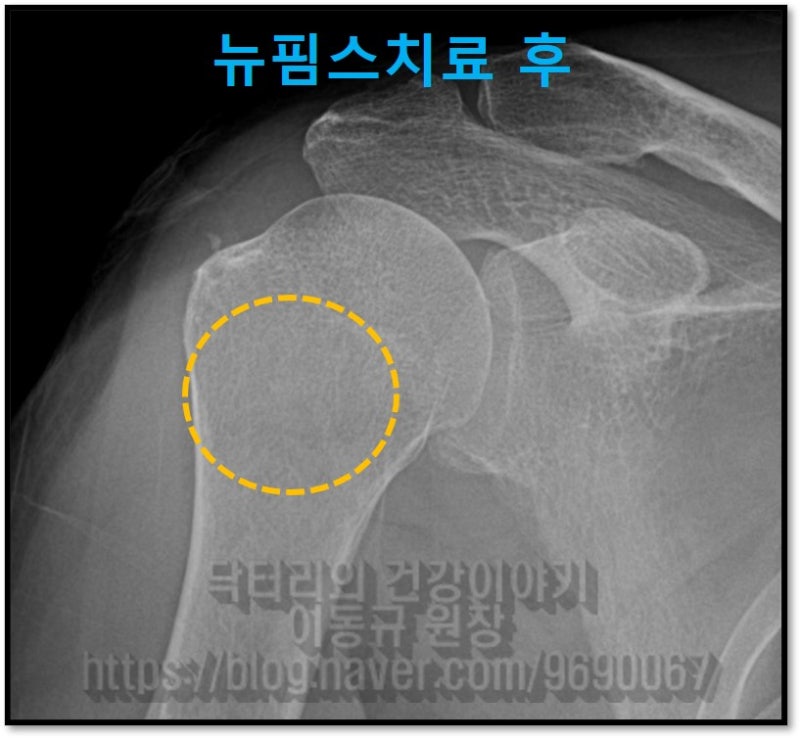뉴핌스 치료 (석회분쇄흡입술) 후 X-ray 를 보면 시술전 보였던 석회가 거의다 제거된 것이 관찰됩니다.