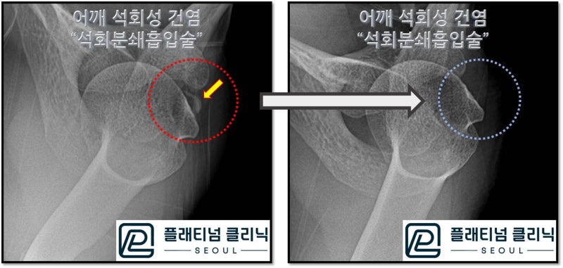 시술 전-후 사진을 비교해서 관찰해 보면 더욱 석회가 없어진 것이 확실히 보입니다. 이 환자의 경우 한번의 시술로 석회를 거의 다 제거했고 추가적인 치료 없이 석회성 건염을 치료했습니다. 환자분은 수술하지 않고 치료되어서 너무너무 만족하셨고 시술도 당일 입원해서 바로 당일 시술하고 퇴원해서 좋다고 말씀하셨습니다.