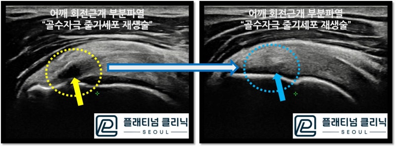초음파 영상을 보면 회전근개는 초음파 상에서 하얗게 보이는 것이 정상입니다. 위의 사진에 보면 노란 원안에 화살표로 표시된 부위를 보면 검게 구멍나듯이 보이는 것이 회전근개의 부분파열 입니다. 관절내측 파열로 보이며 환자는 수차례의 증식치료(프롤로치료)를 했음에도 호전이 되지 않아 저한테 찾아오셨고 골수자극 줄기세포 재생술을 시행하였습니다.