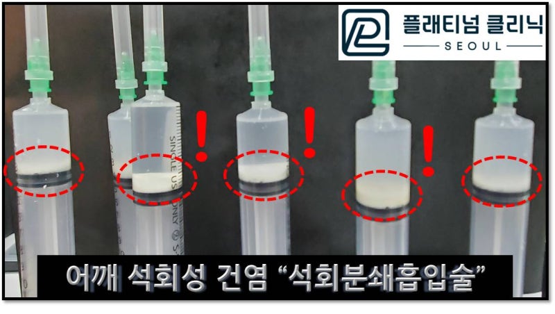 석회분쇄흡입술을 하고 난 후 주사기 사진을 보면 주사기 아래쪽으로 하얗게 가라앉은 것이 석회인데 모든양을 다 합하면 약 3~4cc 정도 흡입이 되었습니다.