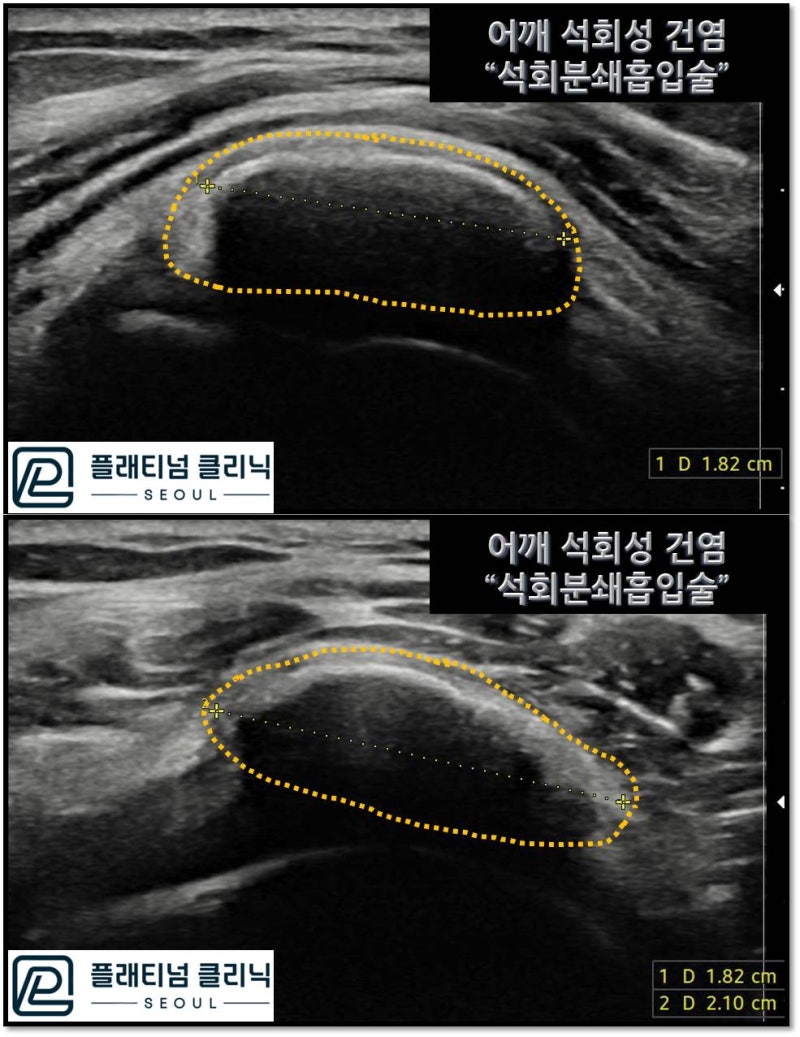 초음파 검사를 해서 크기를 살펴보니 길이 1.8cm, 폭 2.1cm 크기의 석회가 관찰됩니다. 극상근의 폭이 동양인의 경우 2.4~3.0cm 정도되는데 거의 극상근 전체에 걸처 석회가 형성된 것이 관찰됩니다. 이 어마어마한 석회성 건염을 석회분쇄흡입술 로 치료하였습니다. 석회분쇄흡입술에 대해서는 아래 링크를 참고하시기 바랍니다. https://blog.naver.com/9690067/222772754214