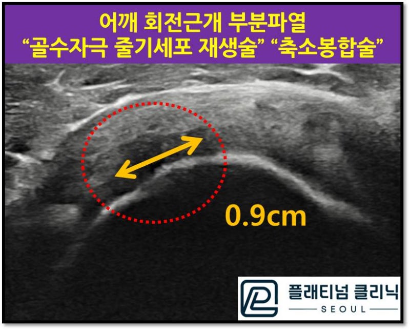 위의 초음파 사진은 회전근개의 단면을 본 사진인데 약 0.9cm 크기의 부분파열이 관찰됩니다. 4년간 주사치료를 꾸준히 했음에도 회전근개가 치유되지 않고 파열 크기가 부분파열에서 큰편으로 판단되어 " 골수자극 줄기세포 재생술" 과 "축소봉합술" 을 시행하였습니다. 골수자극 줄기세포 재생술에 대한 것을 아래 링크를 참고해 주세요. https://blog.naver.com/9690067/222771089454