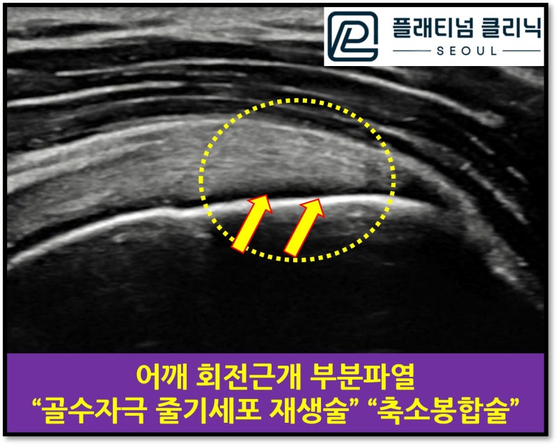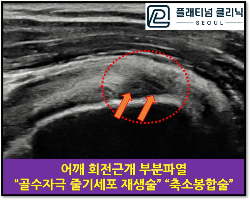 초음파 사진을 보면 회전근개는 초음파 상에서 하얗고 약간의 결이 보이는 것이 정상적인 소견입니다. 빨간 원안에 화살표로 표시된 부위를 보면 회전근개가 검게 변해 있고 중간중간 구멍이 뚫려 있듯 빈공간이 관찰됩니다. 이러한 부분파열을 치료 하기 위해 여러 주사치료를 받았으나 호전이 없던 경우 입니다. 골수자극 줄기세포 재생술 과 축소봉합술을 시행하였습니다.