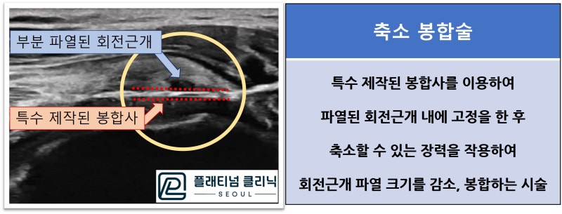 안녕하세요. 정형외과 전문의 이동규원장 입니다. 회전근개 파열이 있는 경우 파열의 정도에 따라 치료 방향이 달라지게 됩니다. 우선 확실한 것은 전층파열(완전파열) 이 있는 경우에는 수술적 치료를 하는 것이 맞습니다. 회전근개는 힘줄(근육과 뼈를 연결해 주는 조직)이기 때문에 한번 파열이 진행되면 시간이 지남에 따라 점점 더 파열이 커지고 안좋아 지게 됩니다. 그래서 완전히 파열이 된 경우에는 어떠한 비수술적 치료로도 치료하기가 어렵습니다. 그럼 완전히 파열되지 않은 부분파열인 경우는 어떻게 치료 할까요? 대부분 우선적으로 주사치료를 시행합니다. 주사치료라 함은 조직을 치유시킬 수 있는 치료를 말합니다. ( 통증주사 나 염증주사 를 말하는 것이 아닙니다. ) 프롤로치료, 증식치료 등등 으로 환자들이 많이 알고 있는 치료 입니다. (사용되는 약제에 따라 종류가 여러가지 있습니다. ) 이러한 치료는 힘줄의 건증이 심하거나 파열 정도가 미미한 경우, 작은 파열일 경우 할 수 있습니다. 하지만 이러한 치료에서 파열이 치료되지 않거나 이미 부분파열이 많이 진행된 경우에는 이러한 주사치료 만으로 치유되지 않는 경우가 많습니다. 그렇다고 수술적 치료를 하기에는 파열의 크기가 양상이 아까운 경우가 많고 이러한 경우가 환자의 입장에서나 치료하는 의사의 입장에서 가장 어려운 부분입니다. 무작정 주사치료를 끌고 가기에도 예상되는 결과가 확실하기 않고 파열이 더 진행되어 완전 파열이 된다면 수술적 치료를 할 수 밖에 없는 상황입니다. 환자도 의사도 답답한 상황일 수 밖에 없습니다. 환자는 수술은 싫고 그렇다고 주사를 한다고 해서 치료된다는 보장도 안되고 통증은 계속 있으면서 삶의 질은 떨어지게 됩니다. 의사는 수술을 하자니 과잉진료가 될 수 있고 이미 충분히 주사치료를 했기 때문에 주사치료를 계속 한다고 해서 좋아지지 않는 다는 것을 알고 있고 그래서 통증을 줄여주기 위해 통증주사(염증주사) 치료를 하면서 견디게 끔만 하다 결국 파열이 더 진행되면 수술적 치료를 할 수 밖에 없습니다. 이런 경우 할 수 있는 효과적인 비수술적 치료가 있습니다. 바로 골수자극 줄기세포 재생술 과 축소 봉합술 입니다. 자세한 내용은 아래 링크를 확인해 주시길 바랍니다. 골수자극 줄기세포 재생술 https://blog.naver.com/9690067/222934136001