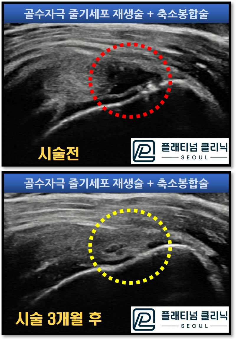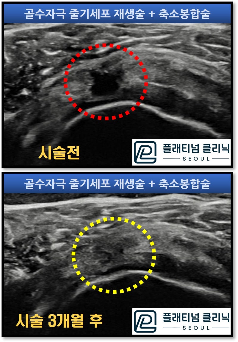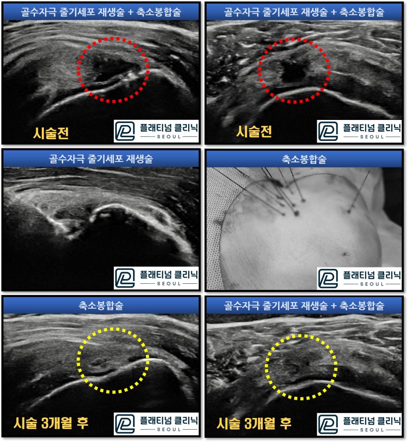 시술은 상완신경충 마취(부위마취, 목에 주사를 맞고 어깨 부위만 마취를 하는 것)를 한 후 초음파를 통해 정확히 위치를 타겟팅 한 후 특수 가이드를 삽입합니다. 이후 특수 제작된 드릴을 이용하여 뼈에 미세한 구멍을 만듭니다(골수자극 줄기세포 재생술). 그리고 특수제작된 흡수 봉합사(일정기간이 지나면 체내에서 흡수됨)를 이용하며 파열된 회전근개를 축소시키는 봉합술을 시행합니다.(축소봉합술) 이 후 힘줄의 치유에 도움이 되는 폴리뉴클에오티드 제제, 콜라겐 제제 를 추가적으로 주입하여 조직이 치유를 효과적으로 촉진시킵니다. 조직이 치유되는 기간은 약 3개월정도 소요가 되며 이 기간 동안 꾸준한 재활을 통해 기능을 향상시킵니다. 3개월 후 다시 초음파 검사를 시행하였습니다.