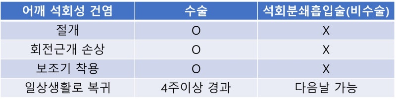 어깨 석회성 건염은 수술이 필요하지 않습니다. 어깨분쇄흡입술로 비수술적으로 치료할 수 있습니다. 일상생활로 바로 복귀 가능합니다. 이동규원장