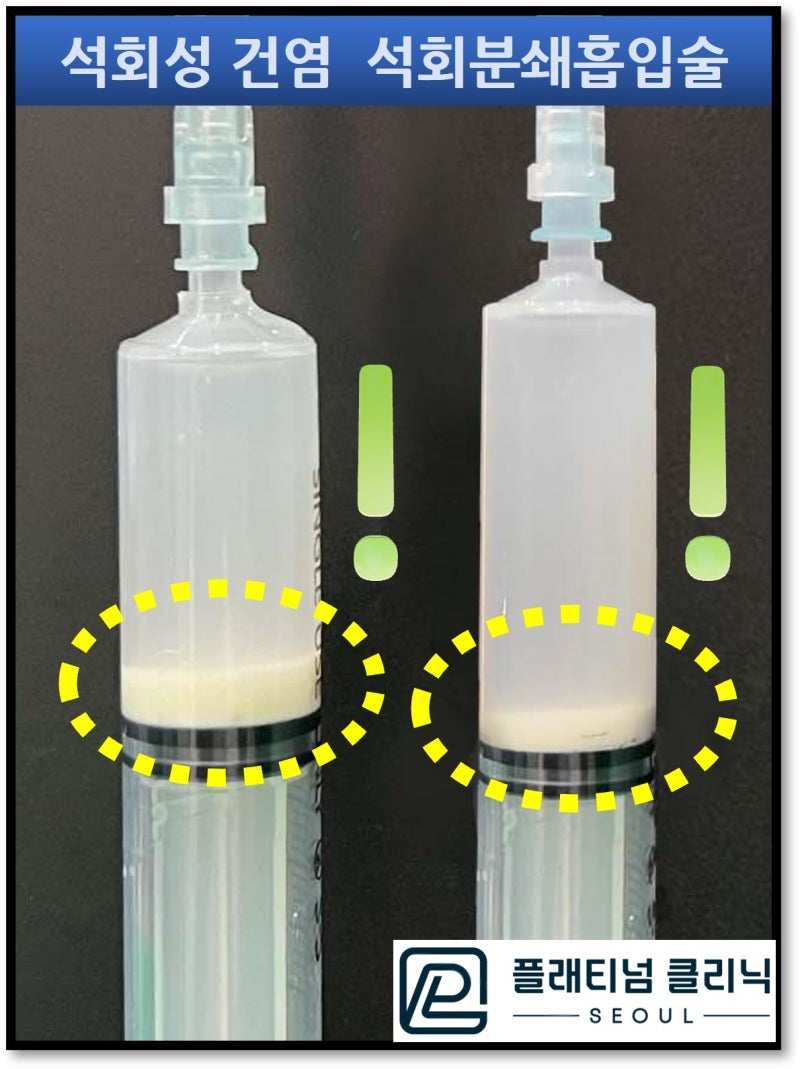 주사기 아래로 하얗게 침전된 석회가 관찰됩니다. 시술 후 X-ray 검사를 시행하였습니다.