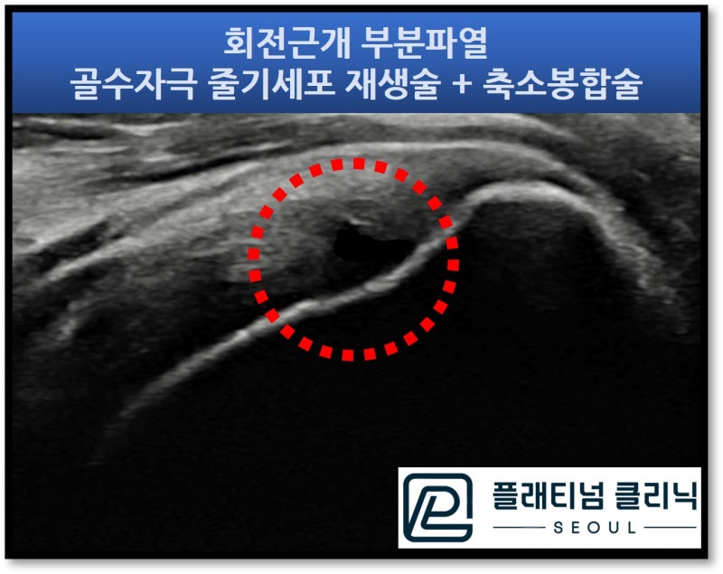 초음파 사진에서 보면 빨간 원안이 원래 건강한 회전근개는 하얗게 채워져 있어야 하는데 전반적으로 검게 관찰이 되며 즉 회전근개가 부분파열이 진행되었고 너덜너덜한 상태로 판단됩니다. 정말 오랜기간 주사치료를 받았고 더이상 호전이 안되며 더 악화되는 양상으로 좀더 침투적이고 근본적 치료를 하기로 하였습니다. "골수자극 줄기세포 재생술" 과 "축소봉합술" 을 시행하였습니다.