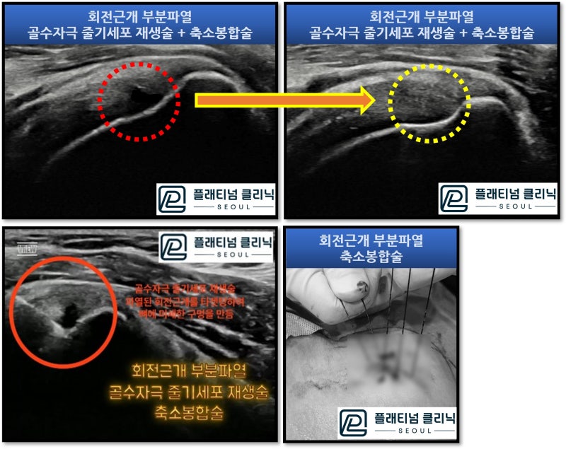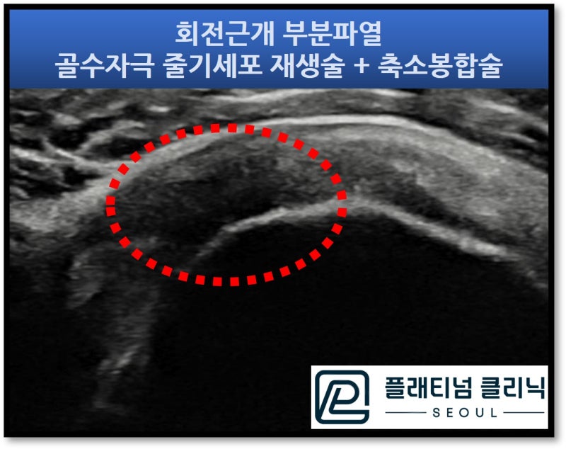 안녕하세요. 정형외과 전문의 이동규원장 입니다. 회전근개 부분파열로 이런 저런 치료를 받으시는 환자분들이 너무 많습니다. 다양한 주사치료(프롤로치료, 재생주사, 증식치료, DNA주사 등등 )를 작게는 수개월에서 많게는 수년간 받으시는 환자분들이 많습니다. 치료가 잘 되서 일상으로 복귀하시는 경우는 너무 좋습니다. 하지만 이렇게 많은 치료를 받았음에도 증상이 호전되지 않고 점점 더 악화되어 수술하시는 경우까지 발생되는 경우가 꽤 많이 있습니다. 회전근개 질환은 점점 더 진행하는 질환이기 때문에 치료가 잘 되지 않을 경우 파열은 더 진행해서 커지게 되며 완전파열이 진행된 경우에는 수술을 할 수 밖에 없는 상황까지 가게 됩니다. 저한테 오시는 정말 많은 환자분들이 오랜기간 어깨 통증에 시달리시고 주사치료를 수도 없이 많이 하시고도 증상 호전이 없으셔서 엄청 고생하셨다고 말씀하십니다. 물론 주사치료가 잘 되어서 좋아지시는 분들도 있습니다. 그렇다면 주사치료는 얼마나 해야 할까요? 일반적인 기준을 말씀드리면 증식치료(프롤로치료 등등 재생을 목적으로 하는 주사 모두를 지칭하겠습니다.)는 1주일에 1회 주사를 기본으로 하며 4~6회를 치료하게 됩니다. 모든 증식치료는 초음파 가이드 하에 이루어져야 손상부위에 정확히 타겟팅을 할 수 있음 치료 과정중에 조직이 치유되는 것 까지 확인할 수 있습니다. 모든 주사치료가 끝난 후 약 4주 정도의 조직이 치유되는 기간이 필요하며 이 기간 이후 다시 검사를 해서 조직의 치유정도를 판단합니다. 즉 증식치료 4~6회 후 4주간의 치유기간 을 생각한다면 2달 반 정도면 증식치료의 치료 결과를 알 수 있습니다. 이러한 결과에 따라 잘 치료가 되었으면 치료 종결, 치유가 어느정도 되었다면 추가적인 증식치료를 할 수 있고, 치유가 잘 되지 않거나 호전이 없다면 다른 치료를 고려해야 합니다. 무작정 주사치료만 받아서는 적절한 치료의 시기를 놓쳐서 수술까지 해야하는 상황까지 갈 수 있습니다. 그럼 주사치료를 많이 했음에도 증상 호전이 없이 회전근개 부분파열이 계속 진행할 때는 어떻게 해야 할까요? 수술까지 하기에는 아깝지만 주사치료에도 호전되지 않고 방치하면 파열이 더 진행해서 완전파열로 진행할 수 있는 경우 보다 침습적인 치료를 해야 합니다. 이러한 경우 "골수자극 줄기세포 재생술(Bone marrow stimulating stem cell proliferation" 과 "축소봉합술(minimalized suture technique)"입니다. 골수자극 줄기세포 재생술은 파열된 회전근개를 초음파로 정확히 타겟팅을 한 후 해당 부위의 뼈에 특수제작된 가이드와 드릴을 이용하여 미세구멍을 만들어 주는 시술입니다. 이러한 미세구멍을 통해 골수가 나오게 되며 이 속에 있는 줄기세표, 혈소판, 성장인자등이 다량으로 분비되면서 조직을 치유시키는 치료법입니다. 축소봉합술은 특수제작된 흡수성 봉합사를 이용하여 파열된 부위를 축소시키고 또한 파열이 진행되는 것을 막아주는 시술입니다. 특수제잔된 흡수성 봉합사는 체내에서 3개월간 유지되며 흡수시 콜라겐 생성을 촉진하여 조직의 치료에 도움이 되는 시술입니다. 모든 시술은 부위마취(상완신경총차단술)를 통해 어깨부위만 마취를 한 후에 진행되며 불안하지 않도록 수면마취를 추가적으로 할 수 있습니다. 평균적 시술 시간은 질병의 정도나 양상에 따라 달라질 수 있으나 25~30분 내외로 진행됩니다. 자세한 내용은 아래 링크를 참고해 주세요. https://blog.naver.com/9690067/223251719566