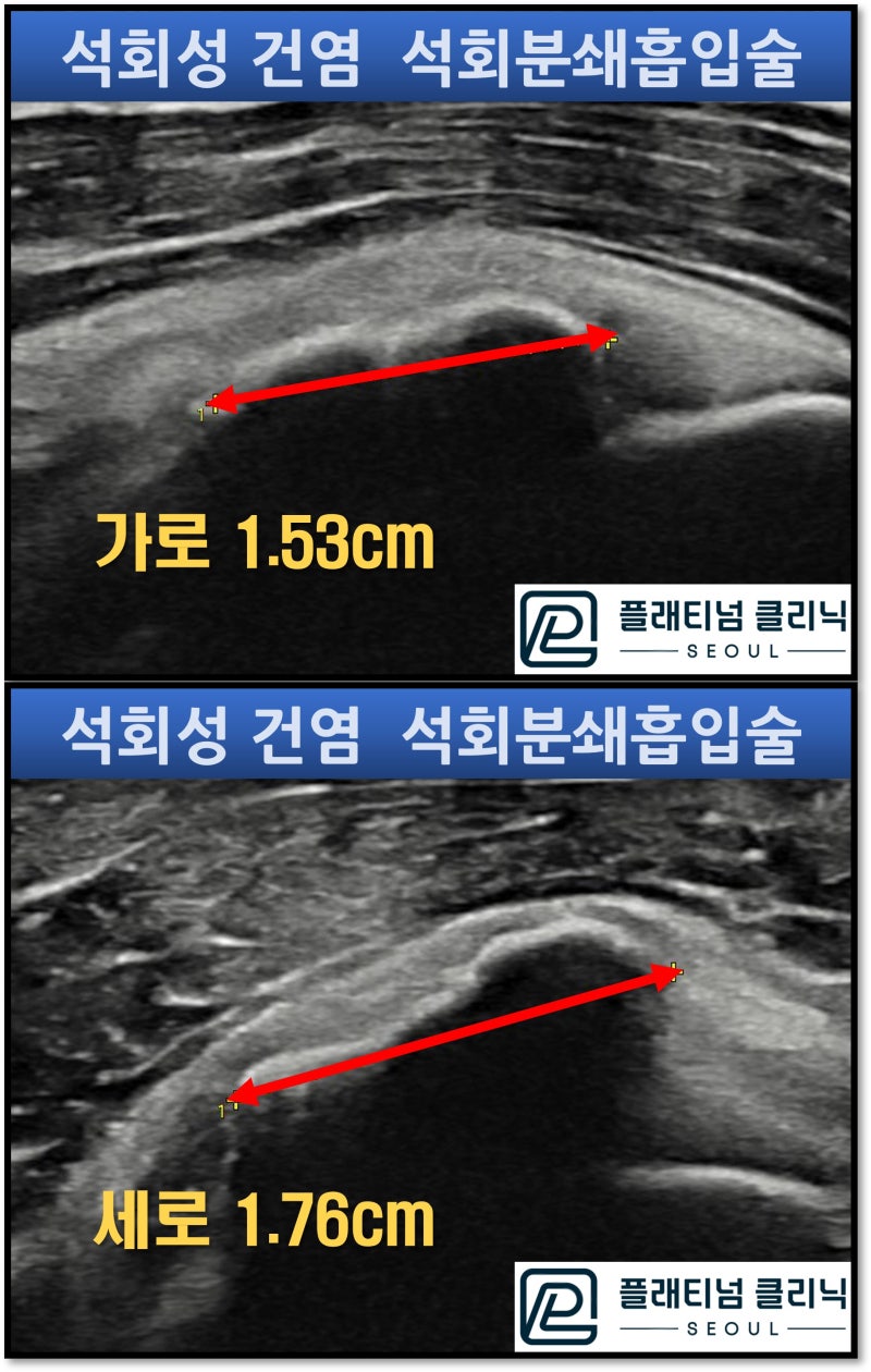 초음파 상에서 가로*세로 1.53*1.76cm 크기의 커다란 석회가 관찰됩니다. 석회분쇄흡입술을 시행하여 석회를 제거하였습니다.