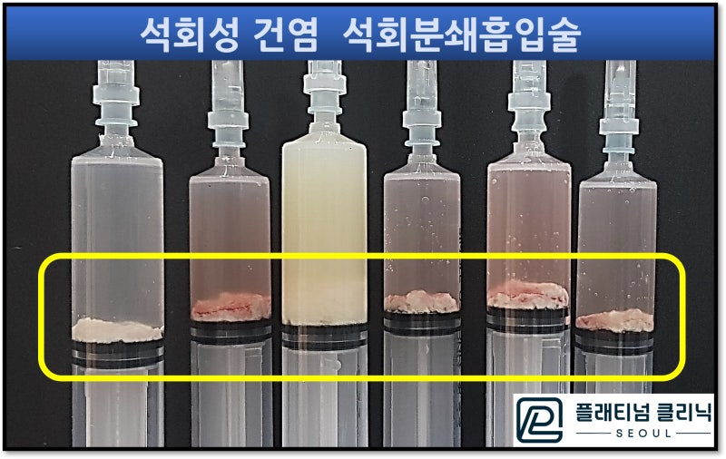 시술 후 주사기 사진을 보면 어마어마하게 제거된 석회가 관찰됩니다. 시술 후 X-ray 촬영을 하였습니다.