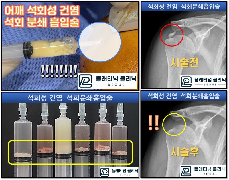 안녕하세요. 정형외과 전문의 이동규원장 입니다. 어깨 석회성 건염. 얼마나 고통스러운 질환인지 겪어 보신 환자분들은 아십니다. 아파서 팔을 움직일 수 도 없고 아파서 잠을 잘 수도 없고 너무 고통스러워서 팔을 떼어 내고 싶다고 할 정도라고 하시는 분들도 있습니다. 이렇게 석회성 건염이 고통스러운 이유는 석회로 인해서 염증으로 인해 힘줄내 압력이 급격하게 증가하기 때문에 생기는 통증입니다. 예를 들어 피부에 뾰루지가 곪았을때 빨갛게 부어오르면서 건드리기만 해도 통증이 있는 것과 유사하게 생각하시면 됩니다. 이럴때 뾰루지가 터지면서 염증성 고름이 나오게 되면 통증이 사라지게 됩니다. 그런데 힘줄내 석회의 경우 어디로 빠져나오질 못하니 그 통증이 해소되지 않고 엄청난 고통으로 나타나는 겁니다. 그럼 석회성 건염의 근본적 치료는 무엇일까요? 바로 석회를 제거하는 것입니다. 석회를 제거하게 되면 물리적으로 석회가 제거되기 때문에 염증이 없어지고 압력이 감소되기 때문에 드라마틱히게 통증에서 벗어날 수 있고 석회성 건염의 근본적 치료도 됩니다. 그럼 석회를 어떻게 제거할까요? 수술해야 할까요? 석회성 건염은 수술없이 치료할 수 있는 질환이며 석회분쇄흡입술로 비수술적으로 석회성 건염을 완전히 치료할 수 있습니다. 아래 링크를 보시면 석회분쇄흡입술에 대해 자세히 설명해 놓았습니다. https://blog.naver.com/9690067/223320621867