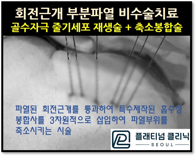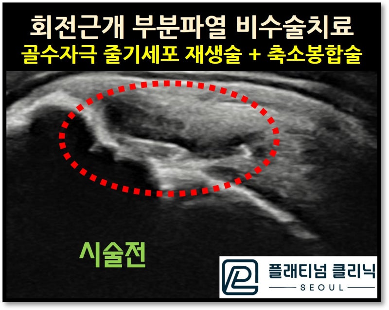 초음파검사를 하니 극상근 부위의 부분파열이 심하게 진행되어 있었습니다. 거의 전층파열에 가까울 정도로 너덜너덜하게 파열이 되어 있었습니다. 주사치료를 할때 초음파를 분명 보면서 했을 텐데 이런 파열을 수년간 주사만 놓다니........ 회전근개 파열은 진행하는 질환입니다. 이전에도 설명드렸지만 힘줄이란 근육과 뼈를 연결해 주는 구조물이기 때문에 점점 더 진행할 수 밖에 없는 질환입니다. 초기에 주사치료를 잘 해서 조직이 치유가 되면 정말 좋지만 그렇지 않은 경우 주사치료를 계속하는 것은 환자분께 시간적, 금전적 손해는 물론이거니와 조직이 퇴행성 변화가 더 진행되면서 질병이 더 악화되어 치료 결과가 좋지 않을 수 있습니다. 다시 환자분 이야기로 돌아가서. 부분 파열의 정도가 꽤 심하고 가동범위제한이 심해서 보다 침투적으로 치료를 결정했습니다. 부분파열이 심하거나 주사치료등 보전적 치료에도 호전되지 않을 경우 할 수 있는 치료. 시술입니다. 바로 골수자극 줄기세포 재생술 과 축소 봉합술 입니다. 아래 링크에 자세히 설명하였습니다. https://blog.naver.com/9690067/223251719566