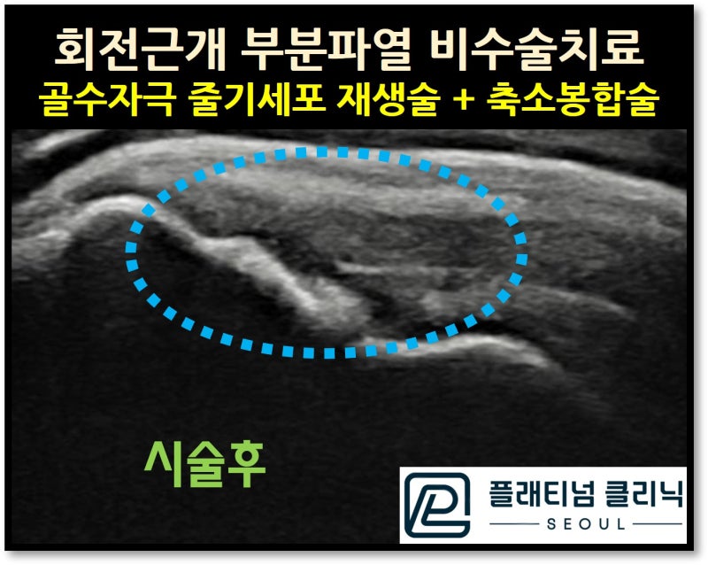 전체적으로 다시 보면 시술전 검게 보이면서 너덜거리던 회전근개 부분파열이 골수자극 줄기세포 재생술 과 축소봉합술 후 하얗게 복원된 것이 관찰됩니다. 회전근개 질환은 먼저 정확하게 진단을 먼저 하는 것이 중요합니다. 가끔 환자분들이 자기가 왜 아픈지, 진단이 뭐지 모르시는 경우가 많고 여러병원에서 다른 진단을 받았다고 헷갈리신다고 하시면서 저한테 오시는 경우가 많습니다. 정확하게 진단을 먼저해야 치료방향을 세울 수 있습니다. 치료를 하다 호전되지 않는다면 과감하게 보다 침투적으로 치료해야 합니다. 치료시기를 놓쳐서 너무 늦어지면 호미로 막을 수 있는 것을 가래로 막아야 할 경우가 발생하게 됩니다. 다행이 이 환자분은 완전파열로 진행되기 전에 저한테 오셔서 수술 없이 치료 될 수 있었습니다.
