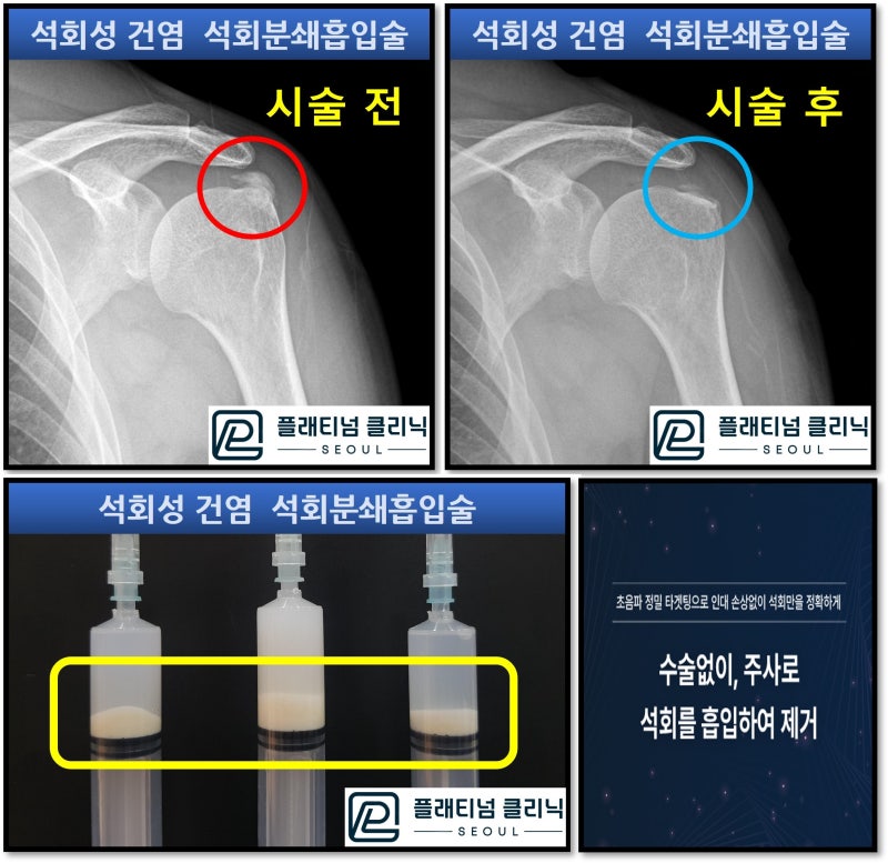 극심한 어깨 통증, 어깨석회성건염. 의사도 치료 받는 비수술적 방법은 바로 석회분쇄흡입술 입니다.