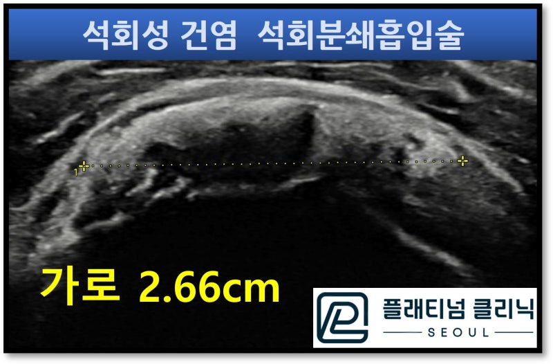 가로 * 세로 2.66*2.01cm 크기의 어마어마한 석회가 관찰됩니다. 동양인 기준으로 극상근의 폭은 2.5~3.0cm 정도 되는데 극상근의 거의 전체에 석회가 있는 것입니다. 환자분은 너무너무 고통이 심하여 팔을 움직일 수도 없을 정도 였습니다. 타병원에서 석회 뽑는 주사 시술을 했다고 했지만 제거되지 않았고 너무 커서 수술을 해야 한다고 이야기를 들었다고 하십니다. 이전에도 말씀드렸지만 석회성 건염은 수술없이 치료 될 수 있는 질환입니다. 석회분쇄흡입술을 시행하였습니다.