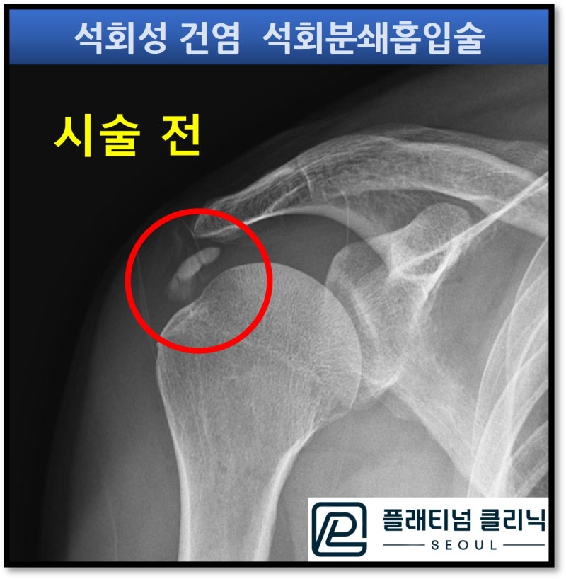 X-ray 상 빨간 원안에 아주 큰 석회가 관찰됩니다. 이렇게 큰 경우 통증이 아주 심했을 텐데... 영국에서 부터 참고 내원하시느라 고생많으셨다고 하십니다.