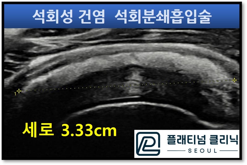 초음파로 크기와 양상을 확인해 보았습니다. 가로*세로 2.27*3.33cm 크기의 어마어마한 석회과 관찰되고 석회의 모양이 다 관찰되는 찐득한 양상의 석회로 판단됩니다. 며칠 뒤 영국으로 다시 돌아가셔야 하고 빠른 치료를 원하셔서 석회를 비수술적으로 제거하는 석회분쇄흡입술을 진행하였습니다. 석회분쇄흡입술은 아래 링크를 보시면 자세히 설명하였습니다. https://blog.naver.com/9690067/223461116411