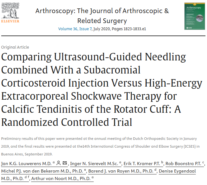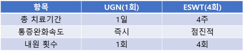 ▲ BMC Musculoskelet Disord 2022 - 바늘 흡입술 vs 충격파 결과 비교 ────────────────────────────────────────────────── 📊 연구 2: 초음파 유도 바늘 치료 vs 고에너지 충격파 출처: Arthroscopy. 2020 연구 프로토콜: • 초음파 유도 바늘 치료(UGN): 1회 시술 + 스테로이드 주사 • 고에너지 체외충격파(ESWT): 4회 세션 (주 1회, 0.35 mJ/mm², 2000 펄스) 결과: • UGN: 1회로 완료, 빠른 통증 완화 • ESWT: 4주 소요, 점진적 개선