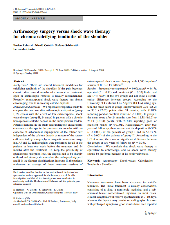 ▲ Ann Rheum Dis 2003 - ESWT 안전성 및 효과 ────────────────────────────────────────────────── 📊 연구 4: 관절경 수술 vs 체외충격파 출처: PMC. 2009 연구 내용: • 만성 석회성건염에서 ESWT와 관절경 수술 비교 • 많은 연구에서 ESWT가 좋은 결과 결론: • 관절경 수술 전 ESWT 또는 바늘 치료 시도 권장 • 수술은 최후 수단