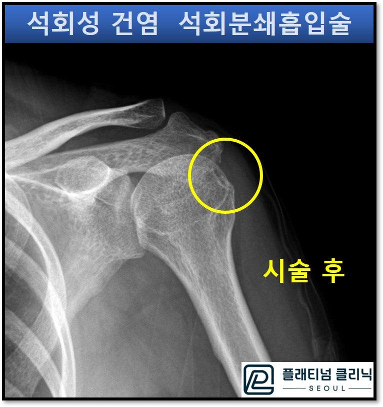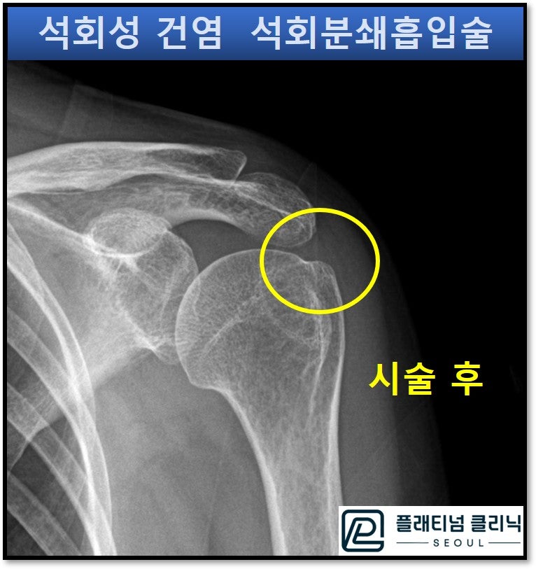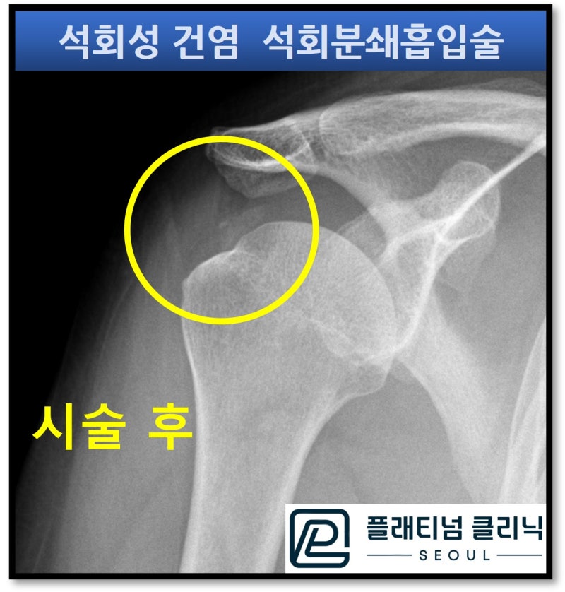 ▲ 시술 1개월 후 X-ray - 석회가 거의 제거됨 ────────────────────────────────────────────────── 📋 사례 2: 충격파 4회 받았지만 효과 없었던 경우 환자 정보 • 52세 남성, 골프 취미 • 주증상: 어깨 앞쪽 통증, 팔을 올릴 때 찌릿함 • 증상 기간: 5개월 타병원 치료 이력 타병원에서 석회성건염 진단 후 체외충격파(ESWT) 4회 시행 (1주 간격). "석회가 부드러워지면 자연 흡수될 것"이라는 설명 들었으나 4회 치료 후에도 통증 지속. 석회 크기도 거의 변화 없음. 플래티넘의원 검사 소견 • 초음파 검사: 극상건에 0.9cm 크기 석회, 여전히 딱딱한 상태 • 석회 단계: 휴지기 - 충격파로 분해되지 않음 • X-ray: 밀도 높은 석회 지속