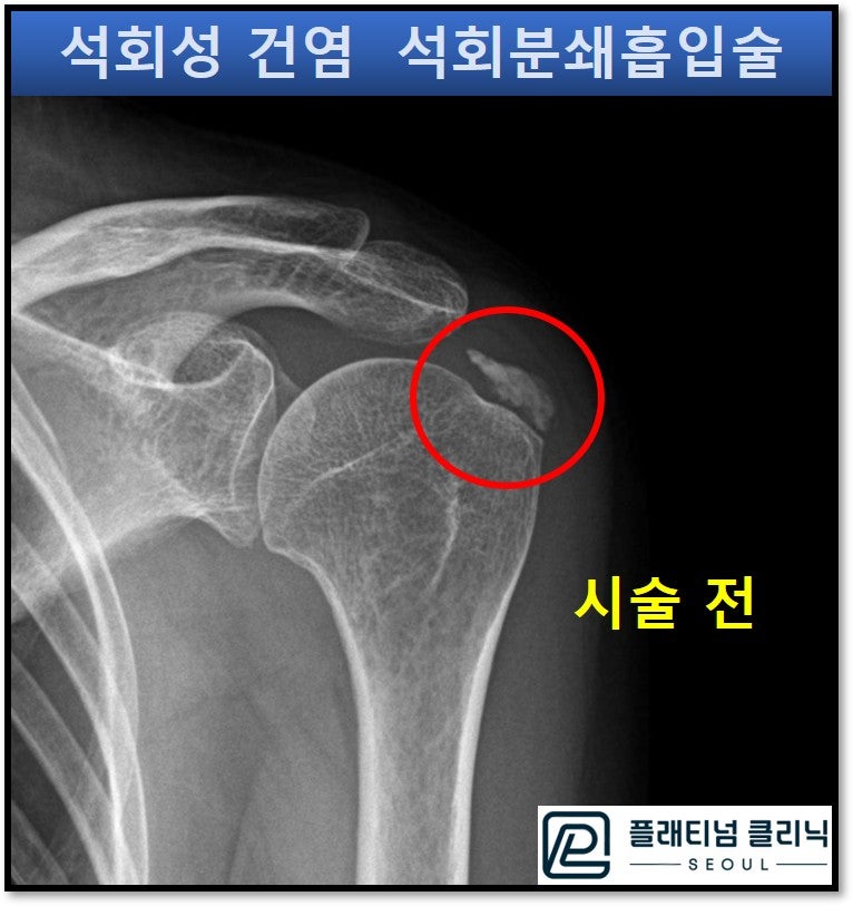 ▲ PMC 2009 - 관절경 수술 vs 충격파 비교 ────────────────────────────────────────────────── 실제 환자 사례 📋 사례 1: 주사치료만 반복하다 악화된 경우 환자 정보 • 45세 여성, 사무직 • 주증상: 야간통, 팔을 들 때 찌릿한 통증 • 증상 기간: 8개월 타병원 치료 이력 타병원에서 석회성건염 진단 후 3개월간 스테로이드 주사 3회 시행. 처음에는 통증이 완화되었으나 2~3주 후 재발 반복. "석회가 흡수될 때까지 기다리자"는 소견 들음. 플래티넘의원 검사 소견 • 초음파 검사: 극상건(supraspinatus tendon)에 1.2cm 크기 석회 침착 • 석회 단계: 휴지기(resting phase) - 딱딱하고 경계 명확 • X-ray: 밀도 높은 석회 확인