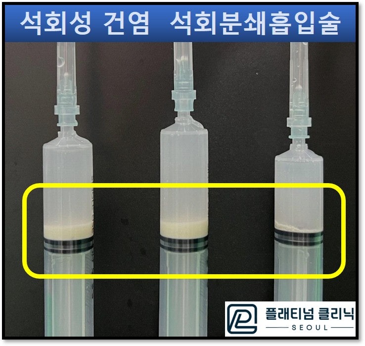▲ 시술 후 주사기 사진 - 석회가 가루처럼 분쇄되어 주사기에 흡입됨 시술 후 결과 • 시술 직후: "1년 만에 처음으로 어깨가 편하다" - 통증 90% 감소 • 1주 후: 야간통 완전 소실 • 1개월 후: 요가 수업 복귀 • 3개월 후: 어깨 운동 범위 완전 회복
