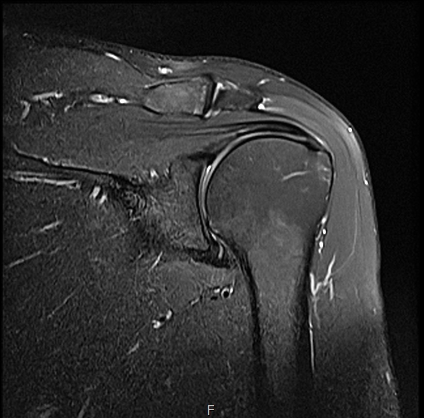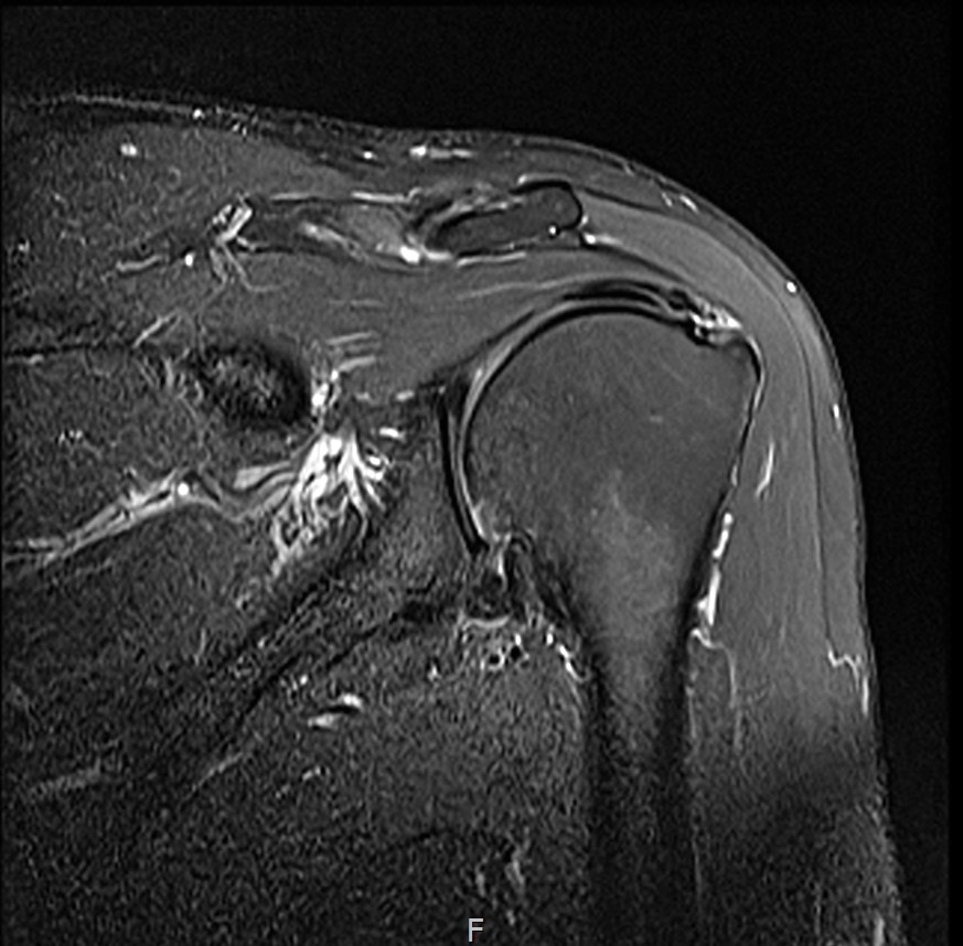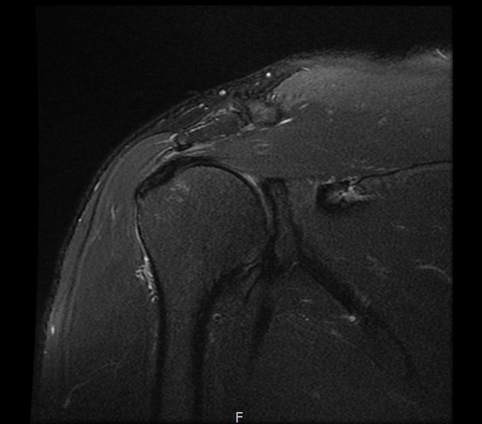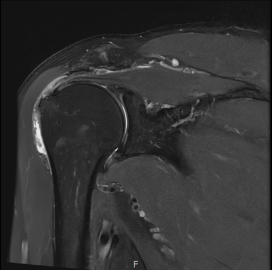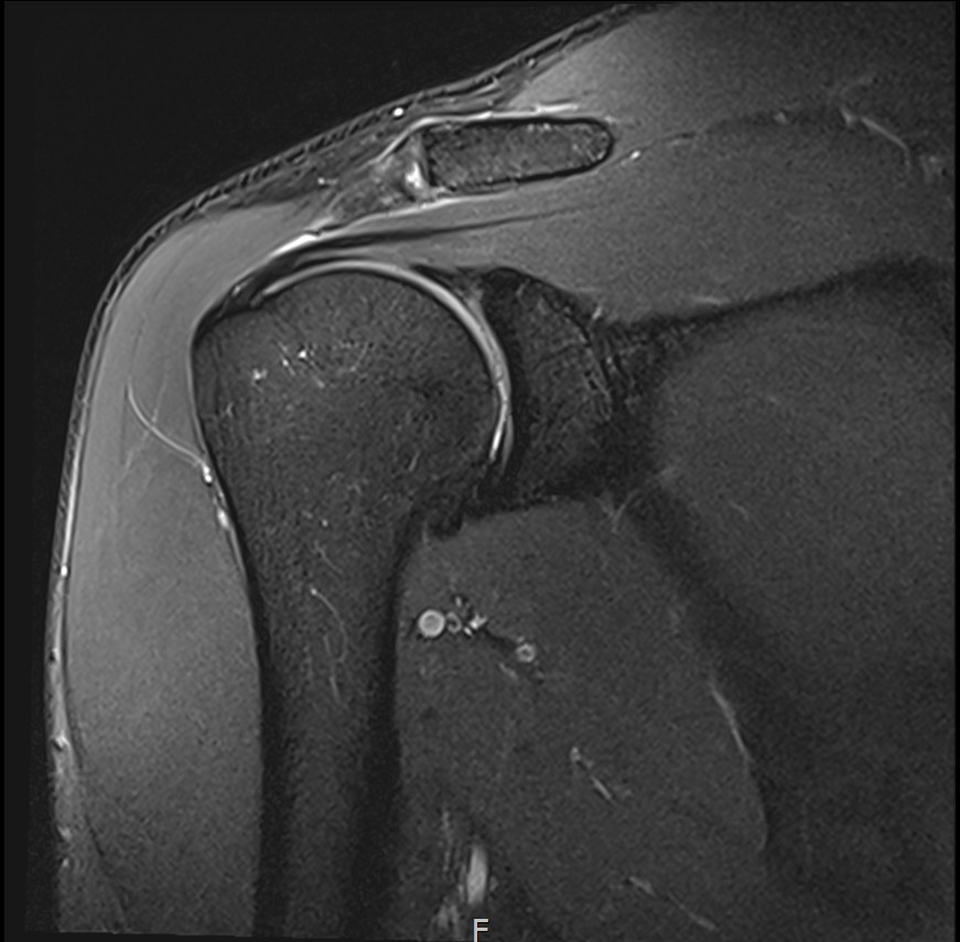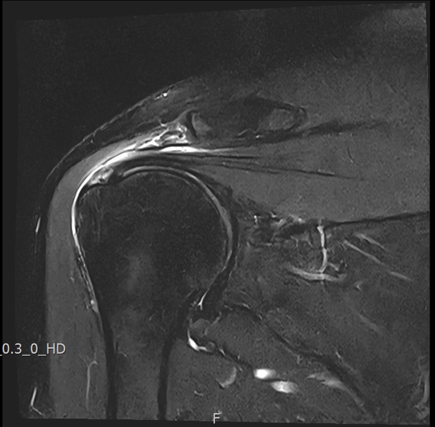 MRI: 극상건 복합 파열 (점액낭면 + 관절면)