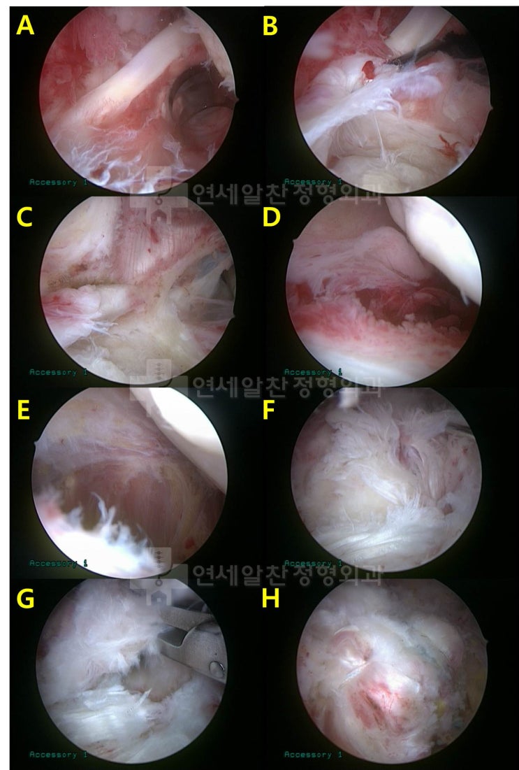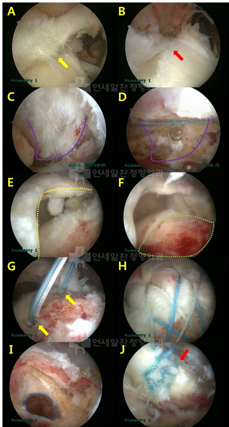 거대한 석회성 건염에서 관절경을 통한 석회 제거술 및 극상근 봉합술(side to side)