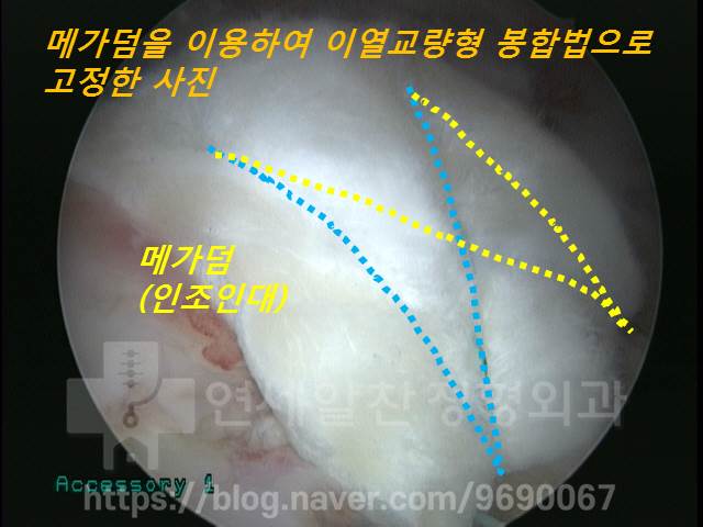 회전근개파열(극상근파열)로 회전근개봉합술(극상근봉합술, 이열교량형봉합법)
