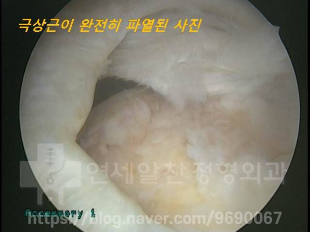 이 환자의 경우 약 1.5cm 가량의 회전근개파열이 있어 관절내시경을 통해 최소 절개 후 파열된 부분을 봉합하는 '봉합술'을 하기로 결정하였습니다. 파열된 부위를 치료하기 위해 내시경으로 확인해보니 회전근개가 완전히 파열되어 상완골에서 떨어진 것을 확인할 수 있었습니다.