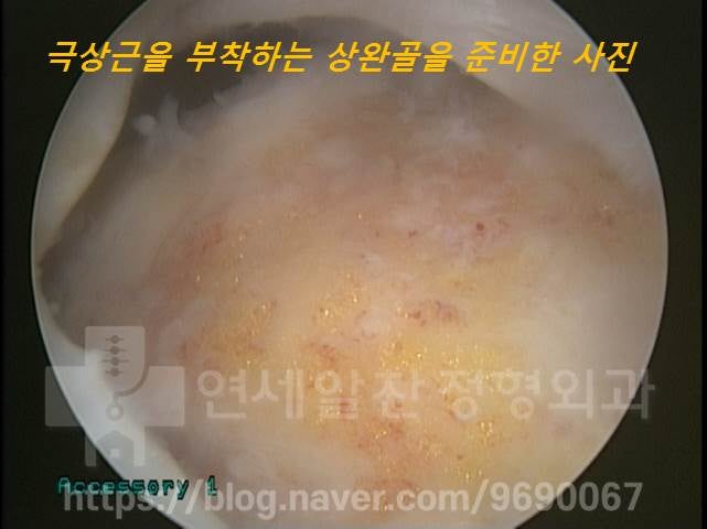 파열된 회전근개를 다시 안정적으로 뼈에 부착시키기 위해 상완골의 뼈를 조금 다듬은 모습입니다. 어깨회전근개파열치료를 할 때는 이 작업이 매우 중요한데, 이 과정이 제대로 진행되어야 파열된 힘줄을 정상적으로 봉합할 수 있고 떨어진 핏줄이 봉합된 힘줄로 들어가서 생착(다른 조직에 붙어서 회복되는 것)할 수 있게 됩니다.