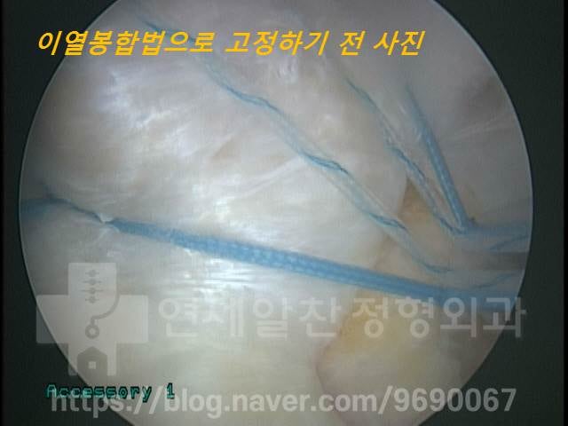 부착 시킬 뼈 내측에 2개의 봉합나사못을 삽입한 사진입니다. 이때 쓰이는 봉합나사못은 인대나 연골 등이 파열되어 찢어진 부위를 꿰맬 때 쓰이는 것으로 찢어진 크기가 클수록 봉합나사못을 더 많이 사용하게 됩니다. 이 환자의 경우 파열 크기가 크지 않아 2개의 봉합나사못을 이용하여 이열 봉합법 수술을 진행하였습니다.